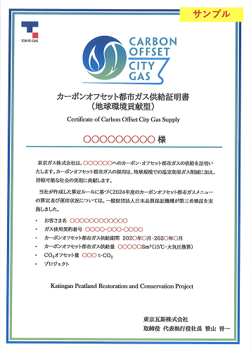 昭島ガスは、東京ガスから都市ガス原料の卸供給を受けており、カーボンオフセット都市ガス(地球環境貢献型)は東京ガスが採用するクレジットにより相殺を行い、第三者検証を経て供給証明書を発行致します。