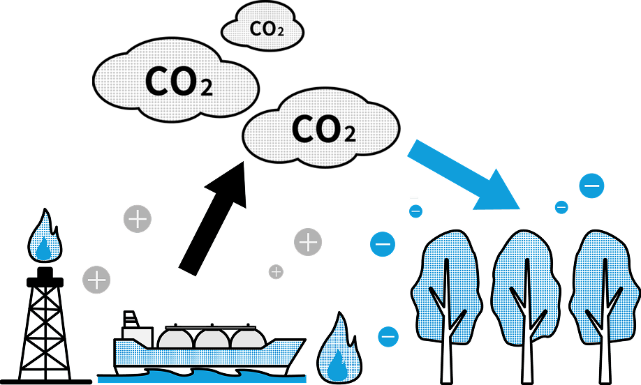 カーボンオフセット都市ガス(地球環境貢献型)は、天然ガスの採掘から燃焼に至るまでの工程で発生する温室効果ガスを、森林保全等で創出されたカーボンクレジットで相殺することにより、地球規模ではこの天然ガスを使用してもCO2が発生しないとみなされるLNGを活用した都市ガスです。